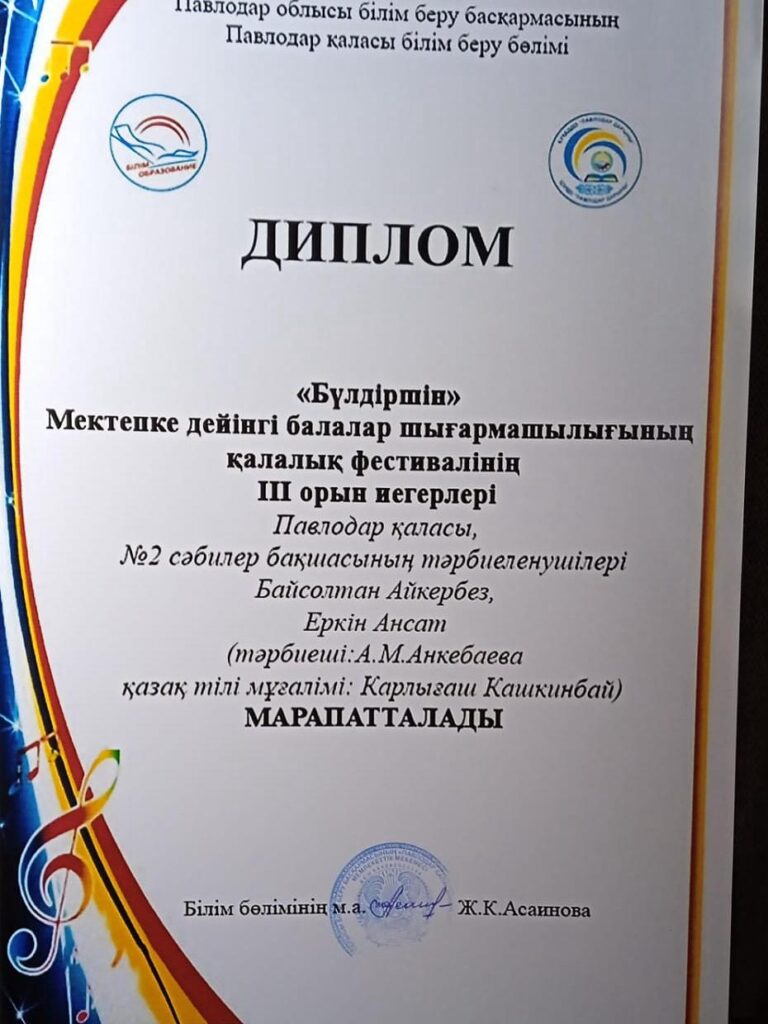 Құттықтаймыз!by sad2-pavlodar11.06.202511.06.2025Құттықтаймыз!Павлодар қалалық «Бүлдіршін» мектепке дейінгі балалар шығармашылығы фестиваліндеIII орын иеленгентәрбиеленушілеріміз — Байсұлтан Айкербез бен Еркін Ансатты(тәрбиеші: Анкебаева А.М., қазақ тілі мұғалімі: Қашқынбай К.)Бөлісу/Поделиться:Добавить комментарий Отменить ответДля отправки комментария вам необходимо авторизоваться.