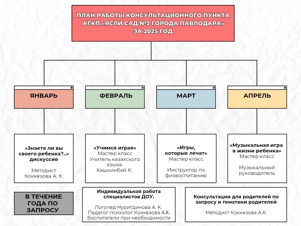 План работы консультационного пункта КГКП «Ясли сад №2 города Павлодара» за 2025 годавтор: sad2-pavlodar30.01.202503.03.2025КП #Кеңесберупункті #консультационныйпунктБөлісу/Поделиться:Добавить комментарий Отменить ответДля отправки комментария вам необходимо авторизоваться.