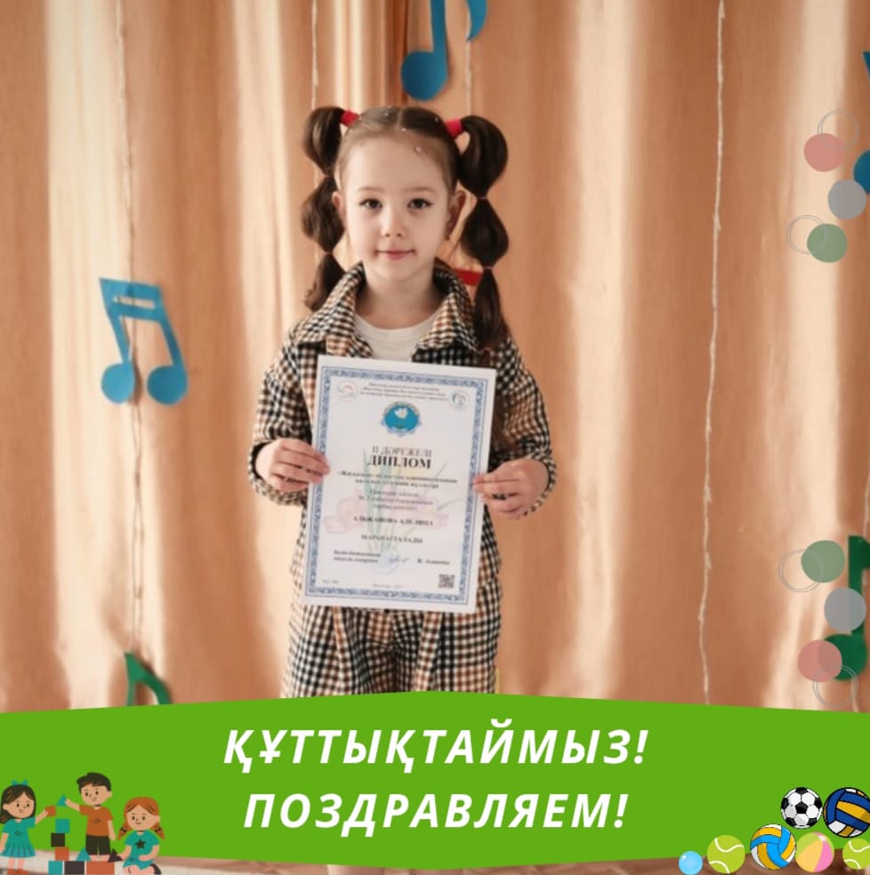 Поздравляем воспитанницу предшкольной «А» группы Альжанову Аделину с занятием II места на городском этапе областного конкурса «Жауқазын» и получением номинации «Зерек бала» на областном этапе!
